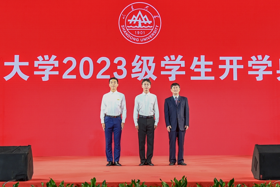 韩圣浩为新生代表、信息科学与工程学院2023级硕士研究生段卓越、法学院2023级本科生王伟杰佩戴校徽。同时,现场所有新生也自行佩戴校徽。校徽是一所大学的鲜明标志,寓意着大学精神的传承。佩戴上山东大学的校徽,同学们将深刻体悟百廿学府的光荣传统和不懈追求,勇于拼搏进取,践行初心使命,不负时代,不负韶华,奋力铸就新时代山大人的新辉煌。